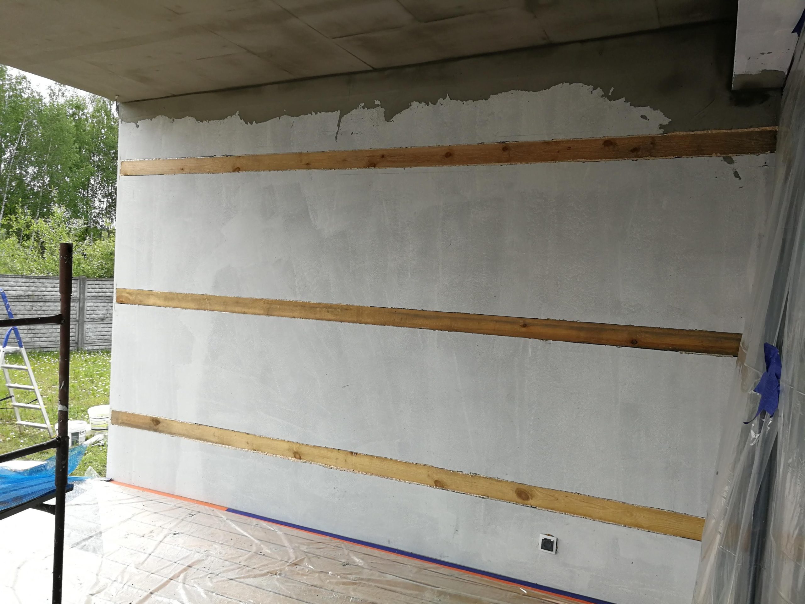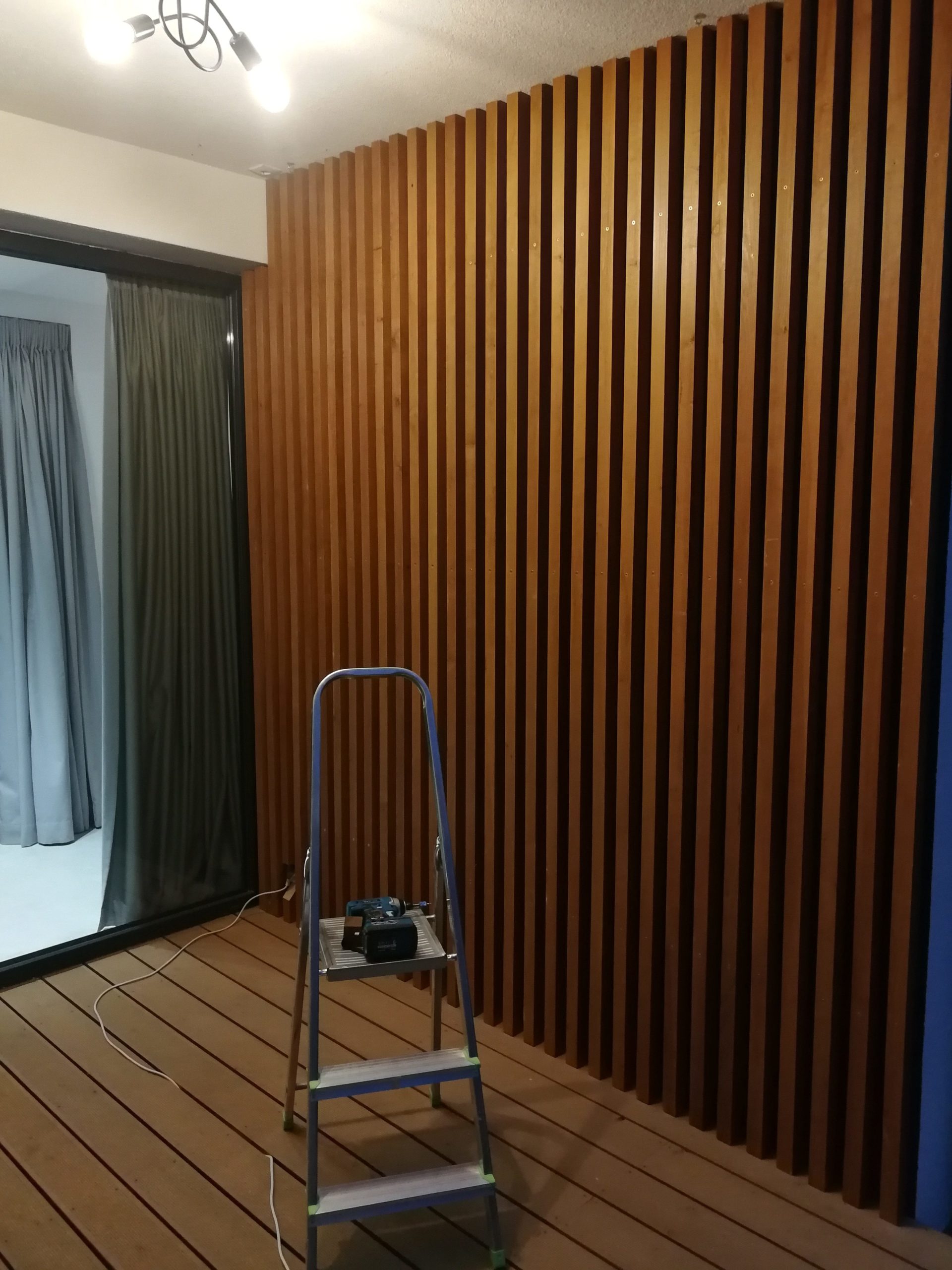 Tak przygotowana ściana czekała na przykręcenie drewnianych listewek/kantówek.
