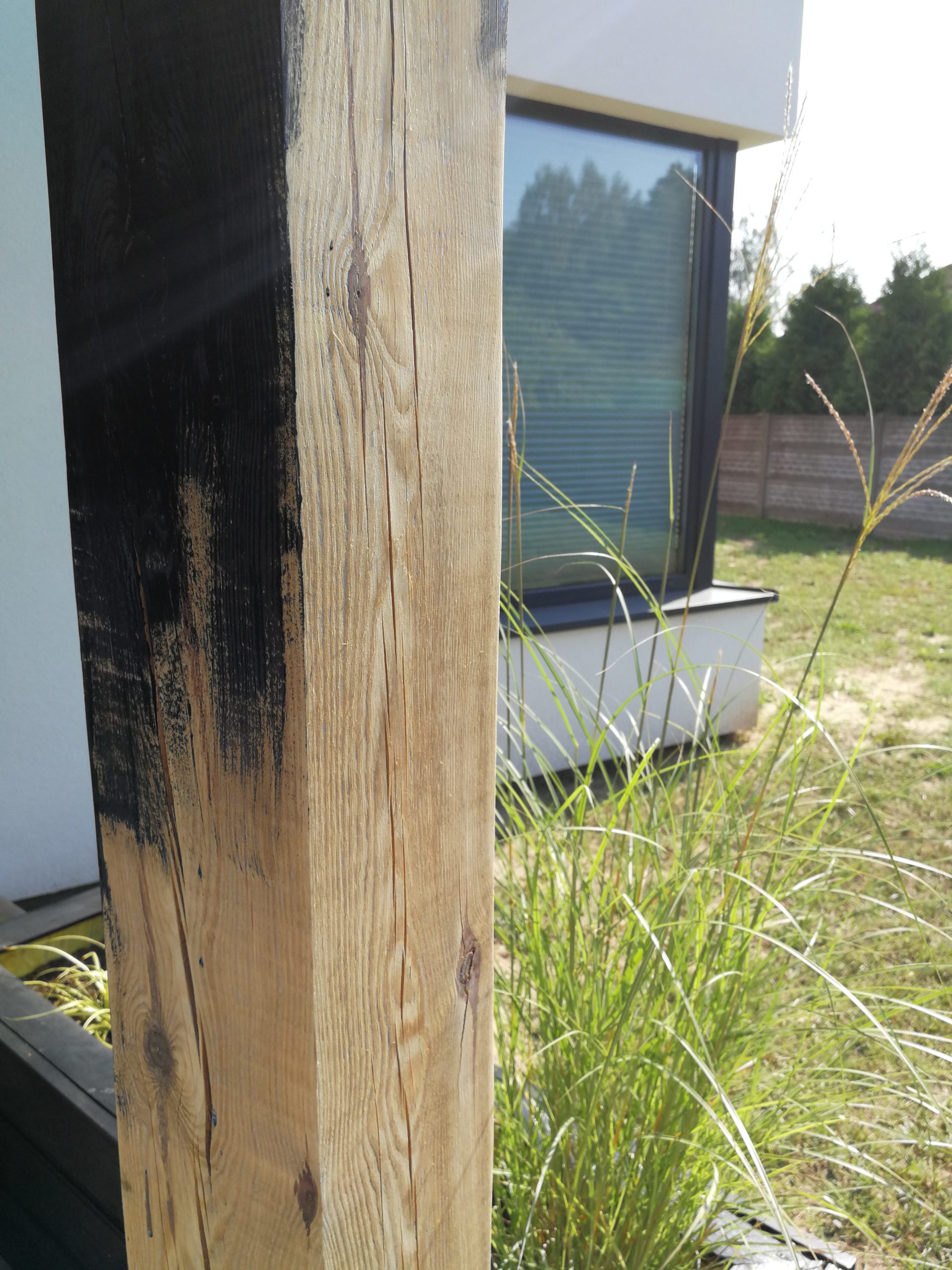 Na jednym z tarasów mamy drewniany słup, który został pomalowany czarną, matową farbą olejną (pozostałość po wykonywanych wcześniej donicach tarasowych, które możesz zobaczyć w tym miejscu). Chcieliśmy aby pokryła dokładnie słup i miała intensywny kolor. Następnie do słupa również przykręciliśmy przygotowane jak wyżej kantówki. Tu efekt nie jest dla nas zadowalający 🙁