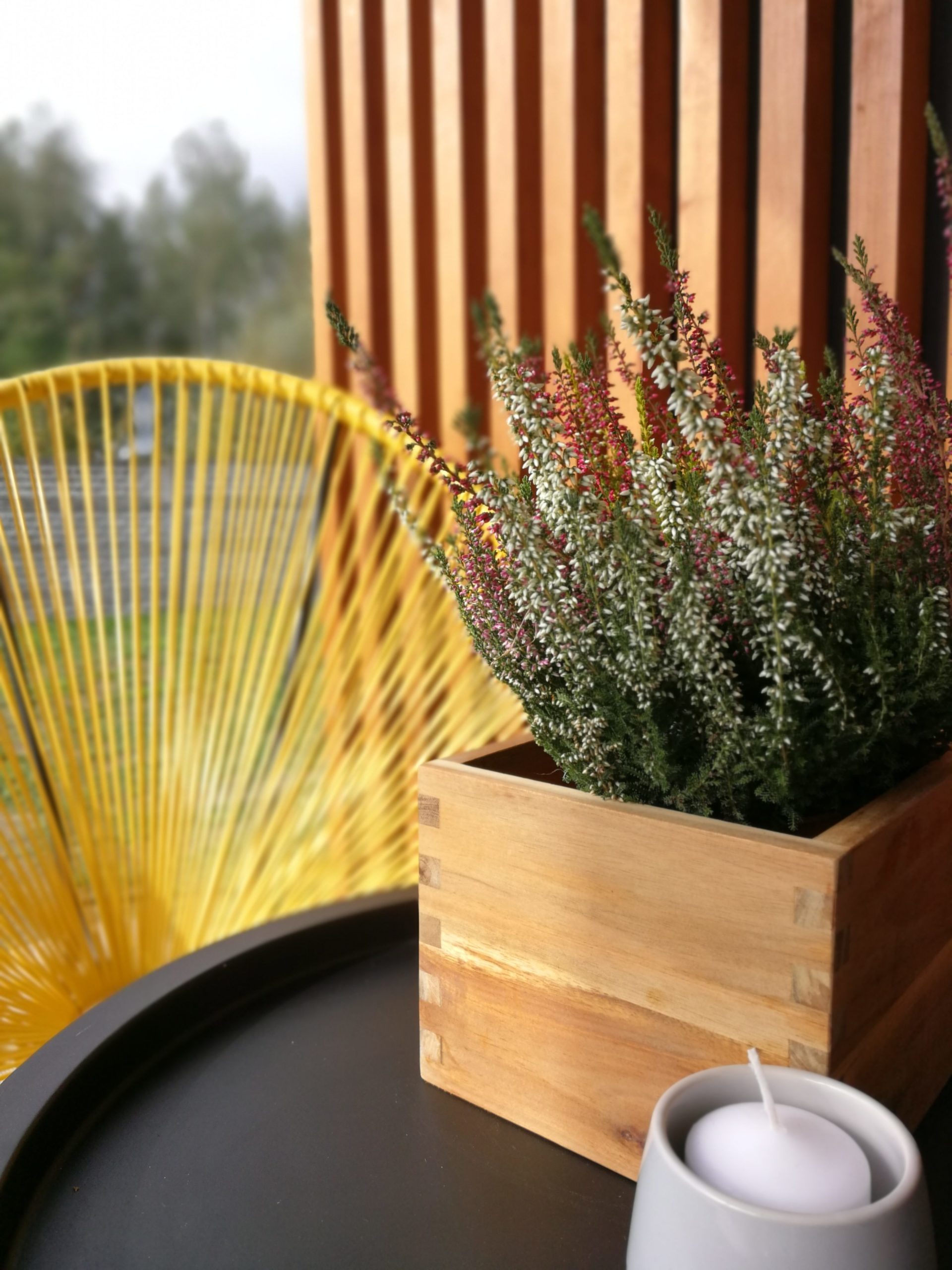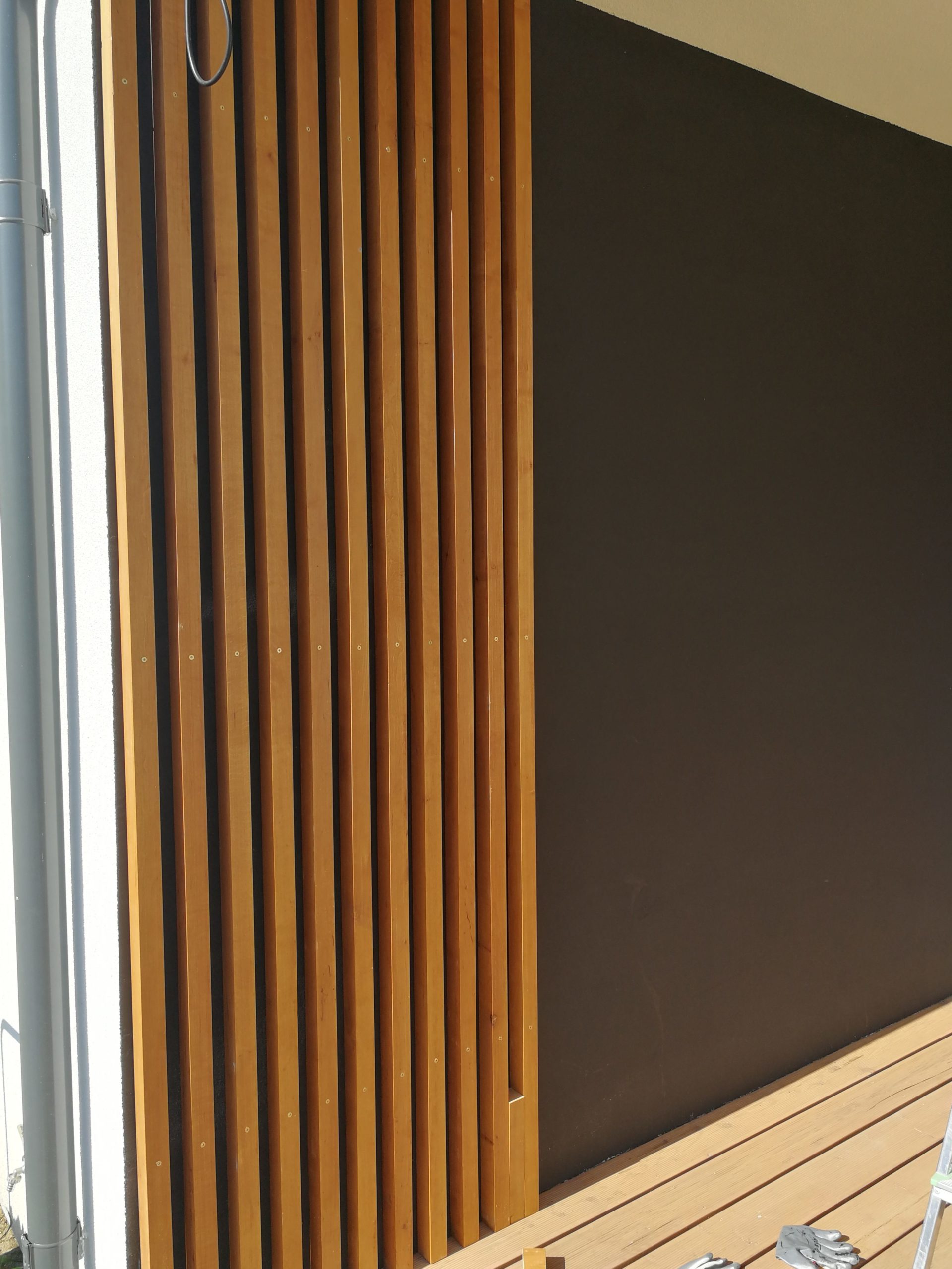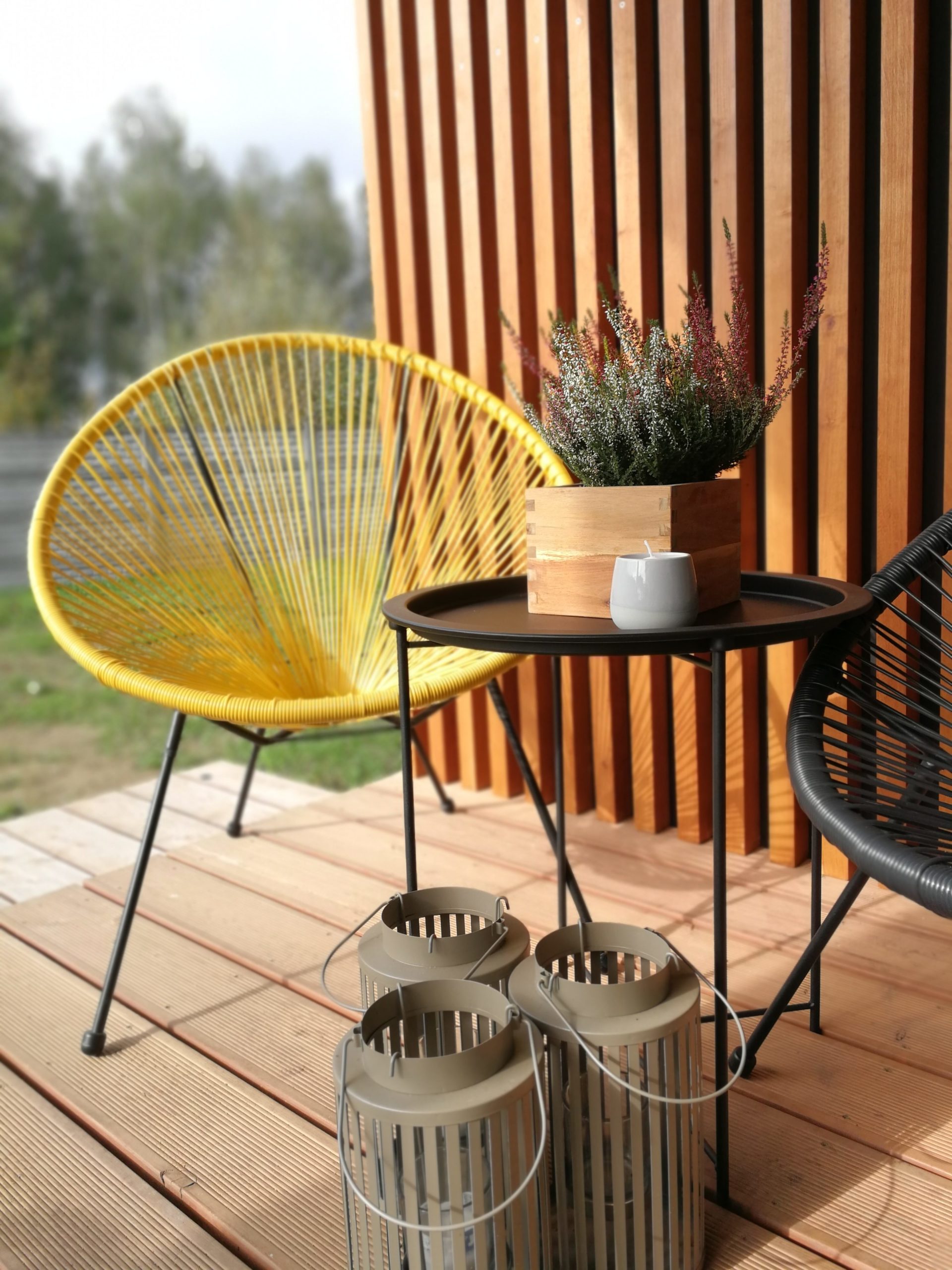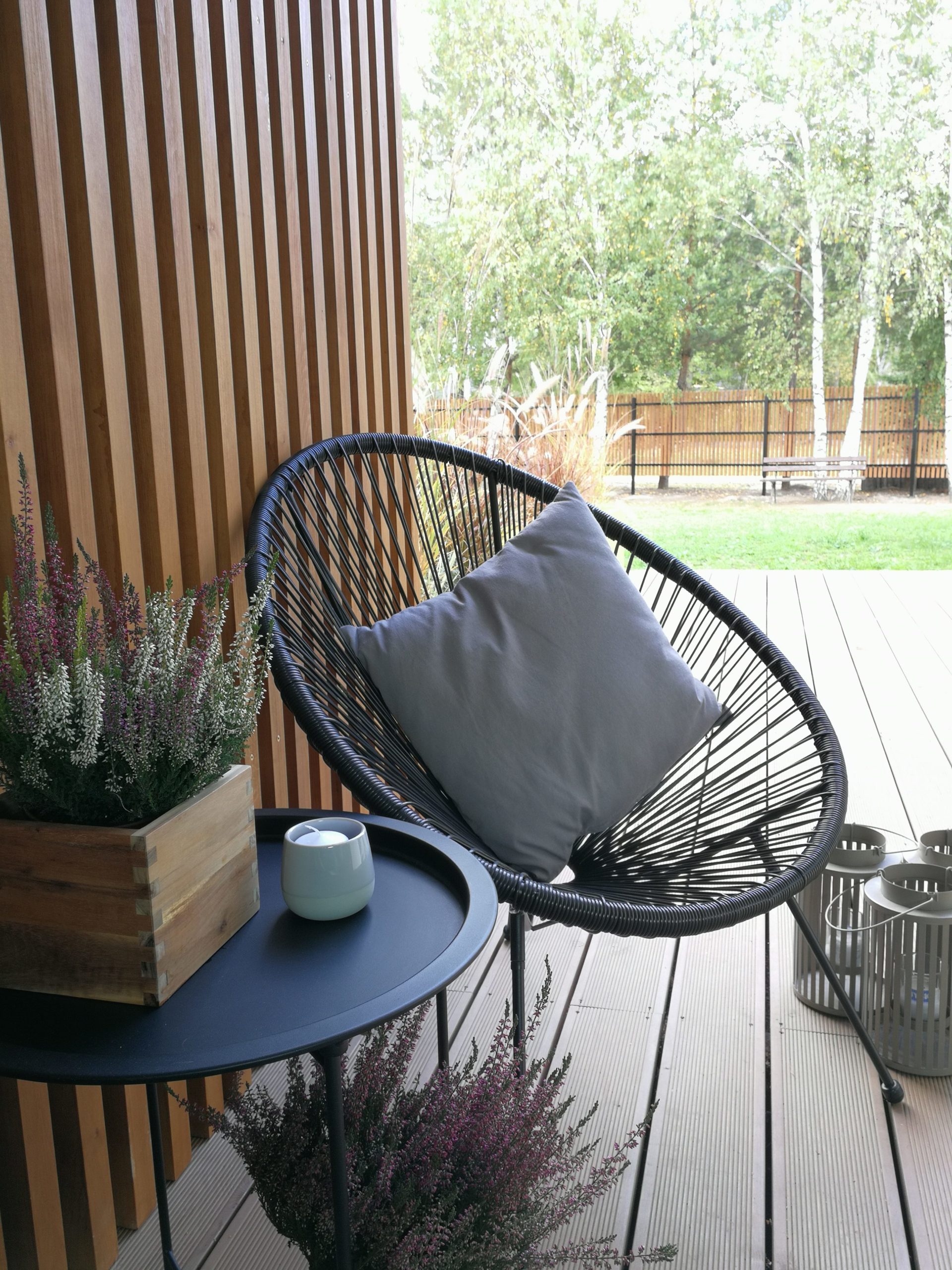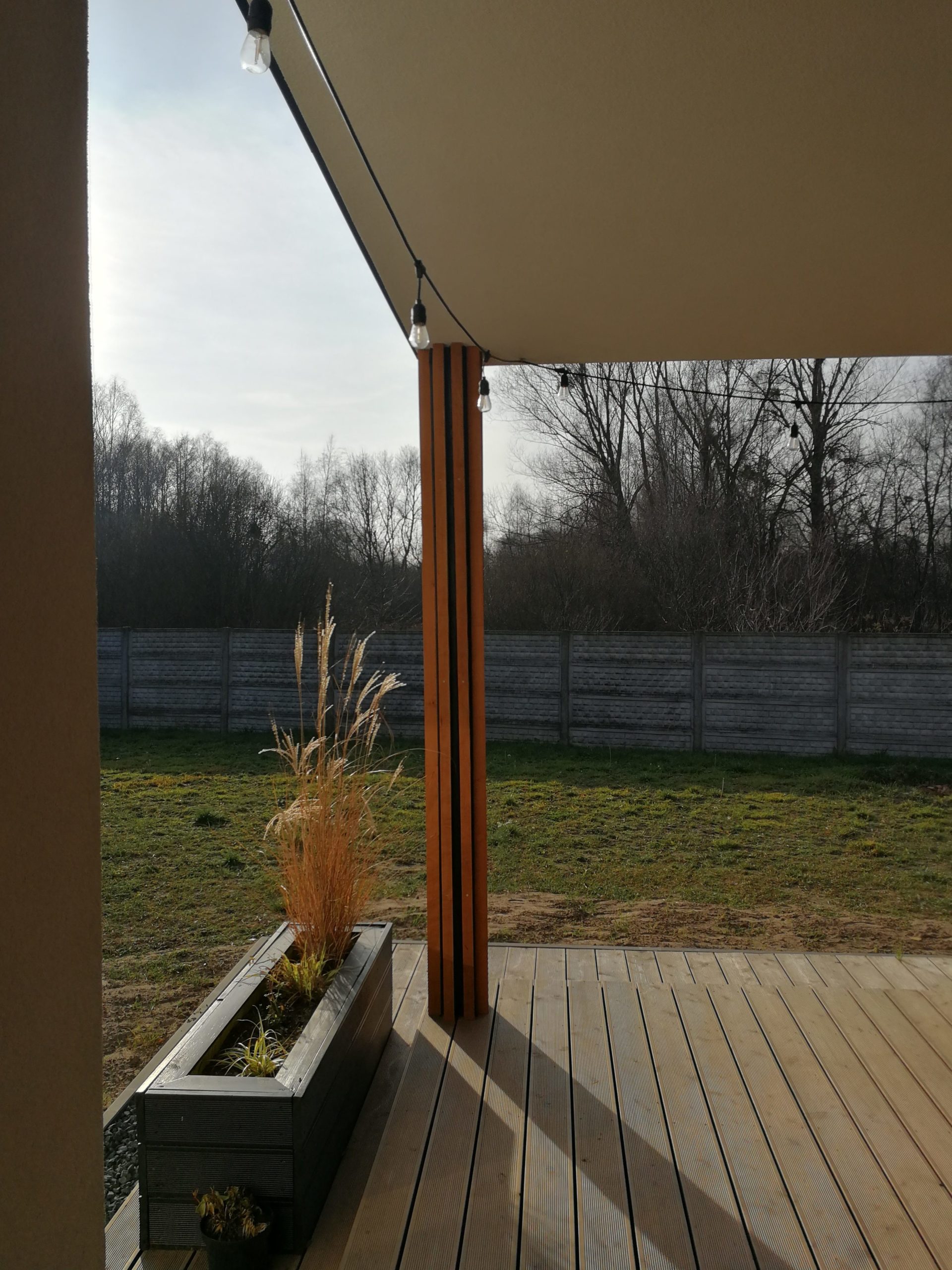 Ściana z drewnianych listewek/kantówek wygląda na tarasie estetycznie i według mnie bardzo ładnie. Dodają charakteru i przytulności naszym tarasom. Są spójne z ogrodzeniem frontowym, wykonanym z tego samego materiału oraz białą elewacją. Pojawienie się tego typu wykończenia na tarasie, dopełniło również wnętrze naszego domu. Dzięki dużym przeszkleniom te dwie ściany są elementem dekoracyjnym dla całości, czyli zarówno wnętrza jak i na zewnątrz. Ponieważ Marcin nie jest typem “złotej rączki” niewiele rzeczy w domu, zrobiliśmy samodzielnie. Jednak prace domowe takie jak ta, wiele uczą i co ważniejsze, sprawiają nam coraz więcej przyjemności.