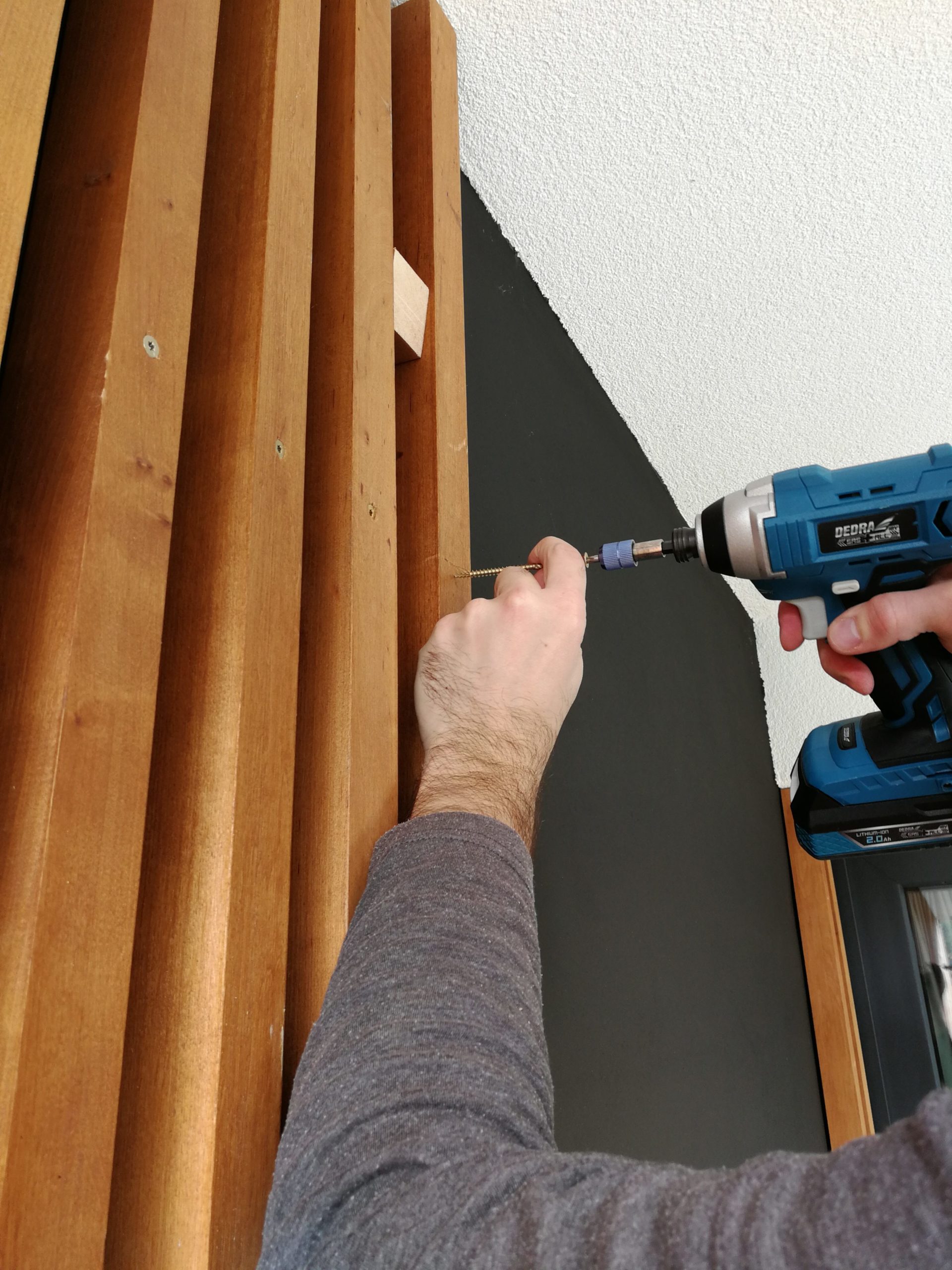 Ważne! Niestety przykręcaliśmy listewki sugerując się tylko poziomami wynikającymi z kantówek stanowiących stelaż. Chyba z ekscytacji 😉 zabrakło nam wyobraźni, aby wyznaczyć poziomą linię przykręcania wkrętów poziomnicą. W związku z tym, w niektórych miejscach widać, że pozioma linia ze śrub “ucieka”. Na początku byliśmy tym faktem zdenerwowani, ale po czasie ma to dla nas swój urok i patrzymy na to z sentymentem.