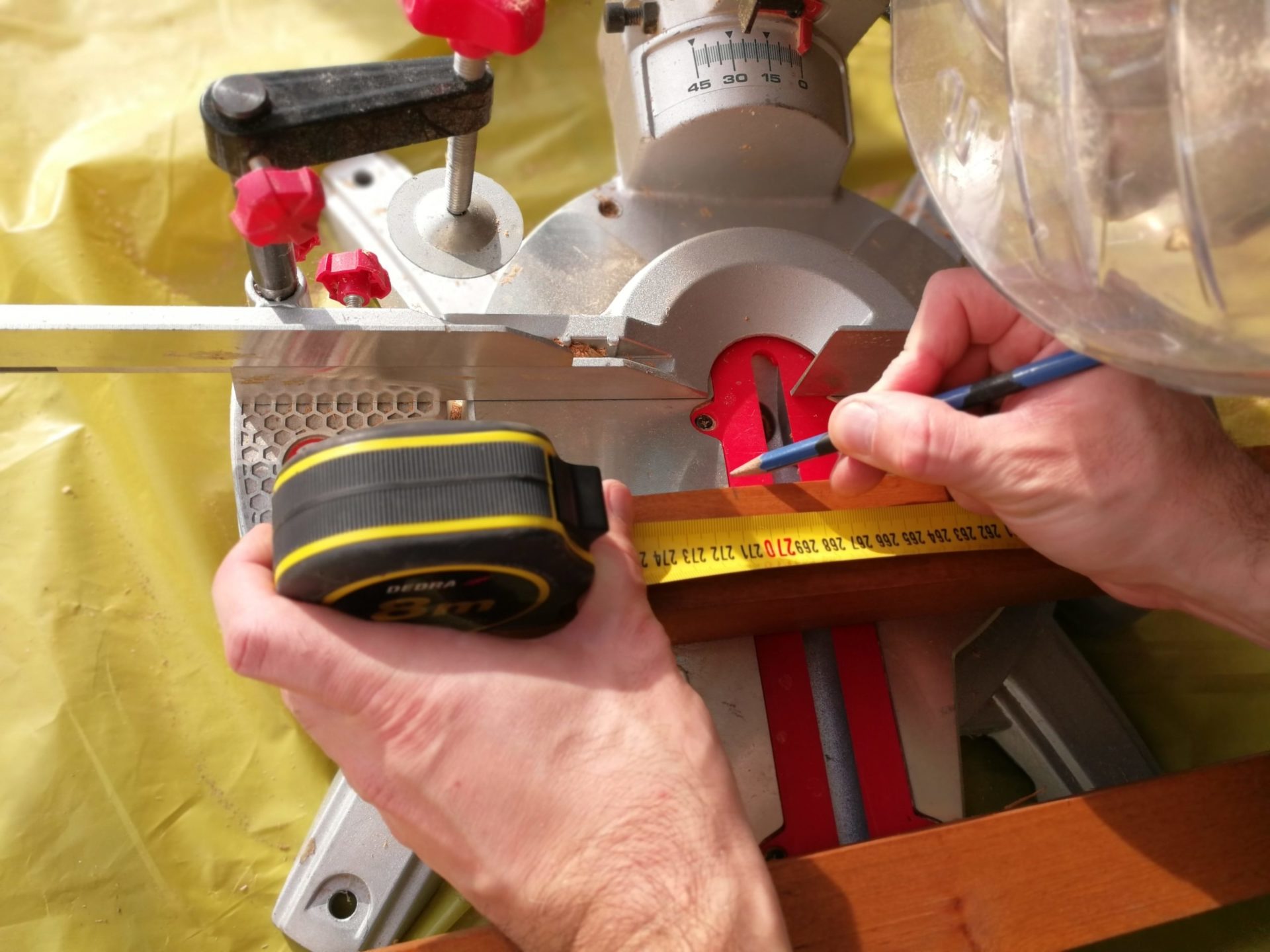 1. Przed docięciem drewnianych listewek Marcin mierzył wysokość ściany w miejscu, gdzie miała zostać przykręcona konkretna kantówka. Każda kantówka była minimalnie innej długości. Ze względu na spadki na tarasie każda musiała być oddzielnie docięta na odpowiednią długość.